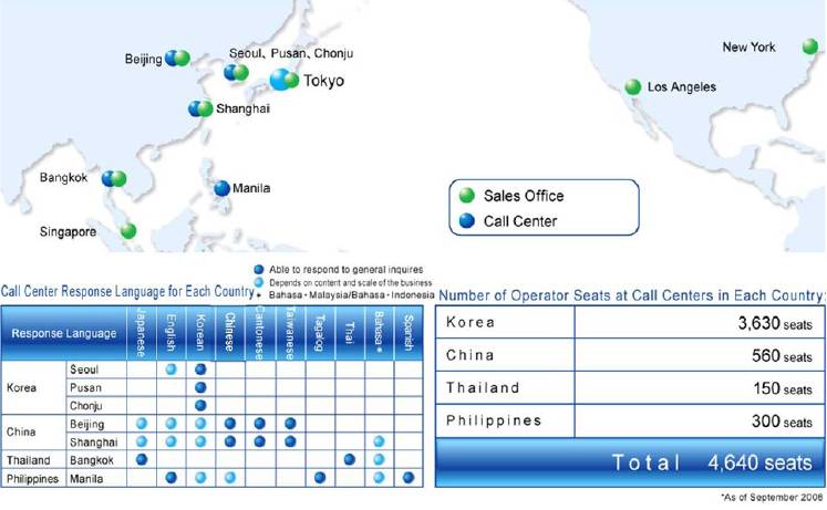 transcosmos于1989年在美國(guó)建立了海外分部并于2001年開(kāi)始進(jìn)軍亞洲的海外市場(chǎng)提供呼叫中心和數(shù)碼營(yíng)銷(xiāo)服務(wù)。Transcosmos在呼叫中心服務(wù)上共投資450,000,000日元而且在6個(gè)國(guó)家的10所城市發(fā)展了本地的呼叫中心服務(wù)。同時(shí),transcosmos為了滿足客戶促進(jìn)業(yè)務(wù)發(fā)展的需求,在亞洲各國(guó)戰(zhàn)略性地設(shè)置了執(zhí)行官以及總監(jiān)級(jí)別的管理層,也建立了可以提供10種主要亞洲語(yǔ)言的構(gòu)架。通過(guò)transcosmos多樣分部的統(tǒng)一管理,提高了服務(wù)質(zhì)量并且在不斷累積的業(yè)務(wù)訣竅和知識(shí)上達(dá)到業(yè)務(wù)效能。