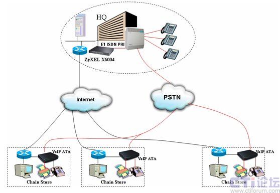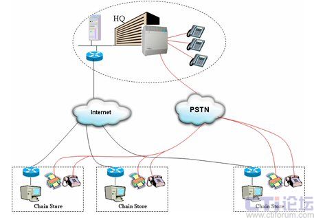 通過(guò)這種架構(gòu),各連鎖分店的話機(jī)與總部?jī)?nèi)部話機(jī)之間的聯(lián)系便可以透過(guò)IP網(wǎng)絡(luò)進(jìn)行,無(wú)須再支付任何長(zhǎng)途通話費(fèi)用。