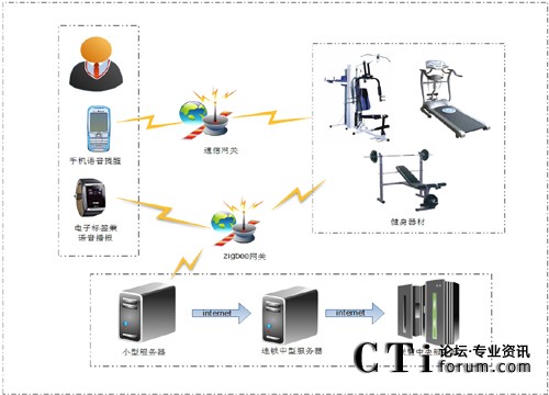 物聯網關:包括電信網關和zigbee網關。電信網關傳輸短信給客戶手機提醒客戶的健身安排,zigbee網關應用于單個健身房內,用于傳輸客戶的運動情況和消費信息以及健身器材的使用情況給健身房的服務器。