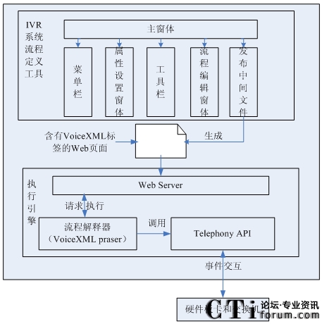 IVR系統(tǒng)執(zhí)行引擎作為IVR系統(tǒng)的核心,是整個系統(tǒng)的控制中樞。它所完成的功能是對IVR系統(tǒng)業(yè)務(wù)流程的解釋和驅(qū)動。