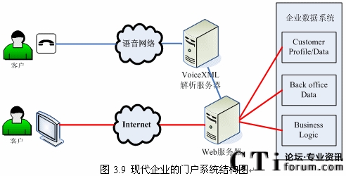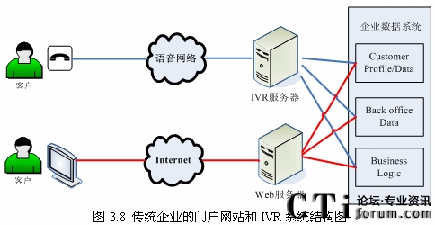 隨著Internet和Web技術(shù)的迅速發(fā)展,越來的企業(yè)開始建立自己的門戶網(wǎng)站,同時又擁有自己的IVR系統(tǒng)(如圖3.8所示),但是兩套系統(tǒng)完全獨(dú)立,語音系統(tǒng)和數(shù)據(jù)系統(tǒng)沒有任何交互或者只有很少的交互。而建立IVR系統(tǒng)的目標(biāo)就是給客戶更好的體驗,使客戶能方便的通過電話完成更多以前需要登陸企業(yè)門戶網(wǎng)站,或者親自去企業(yè)或其網(wǎng)點去辦理的業(yè)務(wù),這就需要IVR系統(tǒng)能跟后臺數(shù)據(jù)系統(tǒng)有更多更好的交互。“語音門戶”的概念出現(xiàn)也愈發(fā)的證明這一點。