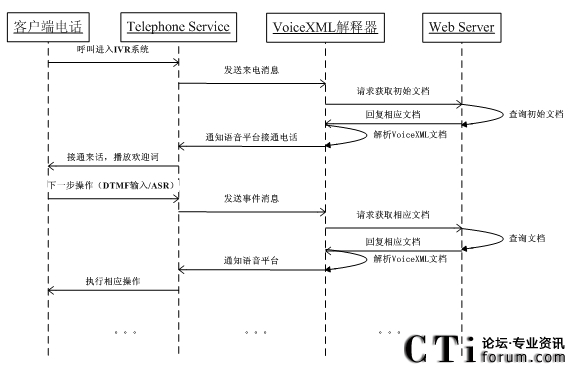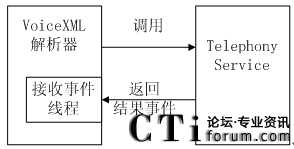 當(dāng)VoiceXML解析器做完解析工作之后,遇到需要語音操作時,就得依靠調(diào)用Telephoney API來完成,同時Telephony Service需要向VoiceXML解析器去返回相應(yīng)的語音操作結(jié)果事件。圖3.15描述了這一過程。