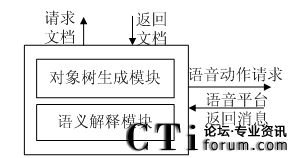 作為VoiceXML語言的解釋工具,文檔解析是VoiceXML解析器主要任務(wù),也是執(zhí)行引擎的重要組成部分,文檔解析的內(nèi)容決定了執(zhí)行平臺的下一步操作,也是整個系統(tǒng)運(yùn)行的核心。因為VoiceXML文檔首先是一個XML文檔,所以主要包含對象樹生成模塊和語義解釋模塊兩個部分。其中對象樹生成模塊是對VoiceXML文檔進(jìn)行XML方式的解析,解釋模塊使用FIA算法對生成的對象進(jìn)行解析。圖3.13描述了VoiceXML解析器文檔解析的模型。