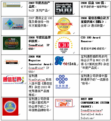 的產(chǎn)品一直在質(zhì)量和易于使用性方面享有盛譽(yù),下面是Polycom音頻產(chǎn)品獲得的部分獎(jiǎng)項(xiàng)。