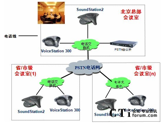 根據(jù)客戶的要求,本著“完善、經(jīng)濟、高效”的原則,我們制定了以下解決方案;系統(tǒng)利用傳統(tǒng)電話網(wǎng)絡(luò),擁有自己的會議管理系統(tǒng);北京總部方面使用Polycom SS2基本型商務(wù)會議電話;各個省/市級分會場,根據(jù)自己會場的情況自選設(shè)備;