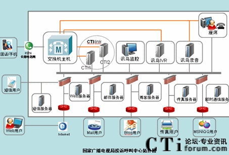 系統(tǒng)主要包含IVR服務器,CTI服務器,短信網(wǎng)關,郵件服務器,傳真服務器,數(shù)據(jù)庫服務器,座席系統(tǒng)等?蛻魮艽蛱胤柎a接入廣電公司客服系統(tǒng),首先由IVR提供自動語音服務。CTI服務器負責所有的電話的路由、排隊、轉接和控制?蛻粼诮邮茏詣诱Z音服務時,如果需要人工幫助,可選擇轉入人工座席。由IVR系統(tǒng)向CTI發(fā)出轉接請求,完成轉接功能。