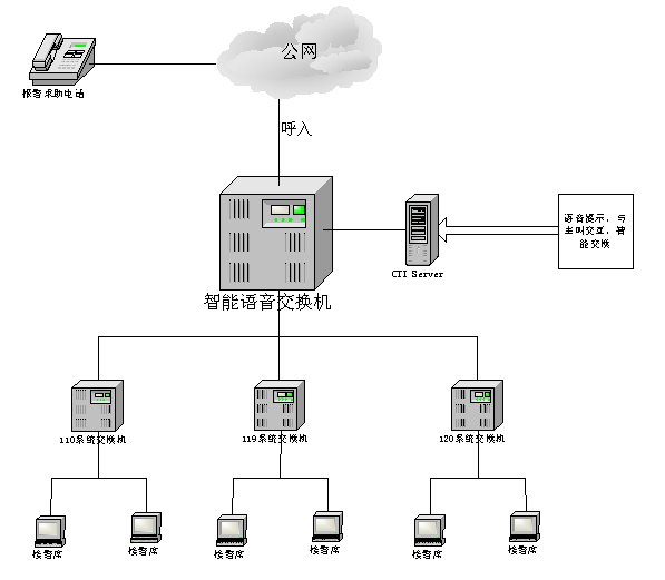 公安綜合信息呼叫中心系統(tǒng)就是在呼叫中心基礎上利用先進的CTI技術,將現(xiàn)存和即將開通的信息系統(tǒng)有機地整合起來;即把數(shù)字語音技術、計算機網(wǎng)絡技術、通信、交換等先進技術結(jié)合起來,結(jié)合公安業(yè)務特點,擴展和增強公安信息應用系統(tǒng)的功能,使現(xiàn)有數(shù)據(jù)庫資源得到充分利用;還可使一部分可以公開或應該公開的公安信息向社會提供增值服務,如出入境辦理查詢、身份證查詢、車輛駕駛員信息查詢等。本系統(tǒng)以110、119、122綜合報警服務為龍頭,以各項公安工作信息化為主要內(nèi)容,以公安計算機信息、通信網(wǎng)絡為依托,以對內(nèi)提供信息多種方式綜合利用、對外提供社會服務為目的,以當前先進的INTENNET、CTI、數(shù)據(jù)庫技術為手段,建立起的對內(nèi)統(tǒng)一受理、指揮調(diào)度、快速反應、協(xié)同作戰(zhàn);對外警務公開、信息咨詢、查詢、投訴舉報為一體的公安綜合信息呼叫中心系統(tǒng)。