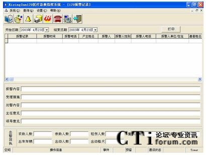 指揮中心信息查詢(xún)系統(tǒng)基于客戶(hù)/服務(wù)器方式。支持全中文檢索及模糊查詢(xún)、組合條件查詢(xún)、記錄瀏覽查詢(xún)、綜合查詢(xún)、提供指揮中心與信息中心間數(shù)據(jù)的雙向數(shù)據(jù)流動(dòng)等功能。還可對(duì)120相關(guān)信息進(jìn)行錄入、分類(lèi)、保存、歸檔、管理維護(hù),并提供檢索及查詢(xún)、綜合匯總、報(bào)表生成、統(tǒng)計(jì)打印及發(fā)送給領(lǐng)導(dǎo)審閱等功能,并可跟蹤值機(jī)人員對(duì)120報(bào)警的受理急救、指揮的每一步驟的處理情況。