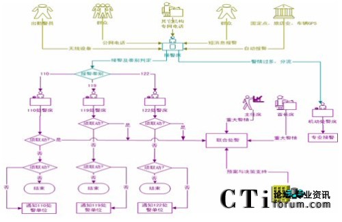 公安指揮綜合管理系統(tǒng)針對公安接處警的工作流程為:報警接收、報警識別、指揮調(diào)度、派警發(fā)送、處警記錄、全過程語音文本信息監(jiān)督、統(tǒng)計分析。指揮調(diào)度中又包括預案編制調(diào)用、有無線通信調(diào)度、實時監(jiān)控信息接收。系統(tǒng)工作流程如下圖所示: