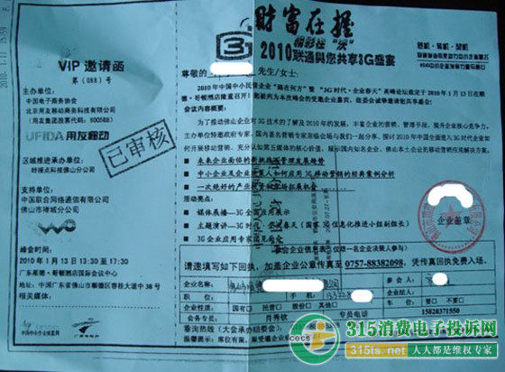 前不久,齊先生接到一個自稱中國聯(lián)通客服負責人的電話,邀他參加“3G經(jīng)濟高峰論壇”。起初他并不相信,但對方發(fā)來的“財富在握”的邀請函上,顯要位置確實打著“精彩在沃,聯(lián)通與您共享3G盛宴”的字樣,并且支持單位也是“中國聯(lián)合通信網(wǎng)絡(luò)有限公司佛山市禪城分公司”(詳見下圖)。一想到中國聯(lián)通是國企,也是大公司,值得依賴,再加上自己是聯(lián)通公司十幾年的老用戶,所以未加多想就答應(yīng)參加了。