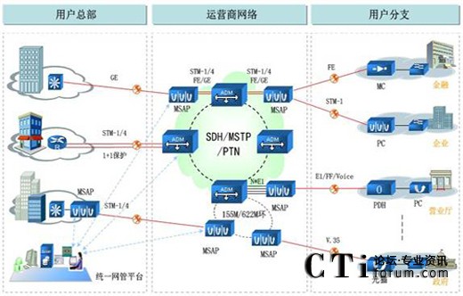 在政府、金融、能源、教育、商業(yè)連鎖等大客戶遠(yuǎn)端機(jī)房,根據(jù)用戶不同類型的業(yè)務(wù)(數(shù)據(jù)、視頻、語音)配置相應(yīng)的轉(zhuǎn)換設(shè)備,如光纖收發(fā)器、V35協(xié)議轉(zhuǎn)換器、以太網(wǎng)協(xié)議轉(zhuǎn)換器、以太網(wǎng)/E1/V35光貓、PDH等,在運(yùn)營商的模塊局/基站等接入機(jī)房部署MSAP機(jī)箱并配置相對(duì)應(yīng)的業(yè)務(wù)線卡,將遠(yuǎn)端PDH、FE、V.35、語音等多種接入方式的多路業(yè)務(wù)匯聚后通過STM-1/STM-4等上行口與運(yùn)營商傳輸網(wǎng)SDH/MSTP/PNT對(duì)接。在運(yùn)營商中心機(jī)房,可以根據(jù)需要配置機(jī)箱式MSAP,匯聚后通過GE光纖接入用戶中心機(jī)房,也可以直接通過155M/622M/FE/GE光纖接入用戶中心機(jī)房,在用房中心機(jī)房配置MSAP進(jìn)行協(xié)議還原,或直接接入用戶核心路由器的CPOS板卡上。這樣,就完成了整個(gè)專網(wǎng)業(yè)務(wù)的接入。