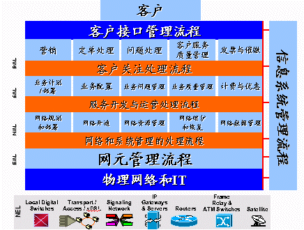 Assurance)的定義是,提供量化的測量指標(biāo),確保網(wǎng)絡(luò)服務(wù)能夠達(dá)到客戶所訂購的要求。(Service Usage)的定義是,測量電信網(wǎng)絡(luò)中各種業(yè)務(wù)的使用情況,計(jì)算處理使用電信業(yè)務(wù)的應(yīng)收費(fèi)用,并對電信業(yè)務(wù)的收費(fèi)過程提供支持。這是從縱向的角度來看,而從橫向的角度來看,從電信管理的角度來看,OSS主要處在三個管理層面:客戶服務(wù)層;業(yè)務(wù)管理層;網(wǎng)絡(luò)管理層。