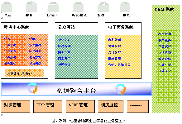 為解決傳統(tǒng)物流企業(yè)"成本高"、"效率低"的瓶頸問題,物流行業(yè)信息化目前已經(jīng)超越了關(guān)注和觀望,第一層次的信息化平臺(tái)在很多企業(yè)已經(jīng)實(shí)施,如內(nèi)部的財(cái)務(wù)管理、倉儲(chǔ)管理、定單管理、運(yùn)輸管理等,相關(guān)系統(tǒng)包括ERP、物流管理(LM)、SCM等應(yīng)用系統(tǒng)。更進(jìn)一步,針對(duì)物流企業(yè)核心是提供"服務(wù)"這個(gè)概念,呼叫中心、電子商物、以及CRM技術(shù)的結(jié)合將對(duì)物流基礎(chǔ)信息平臺(tái)起到至關(guān)重要的整合作用: