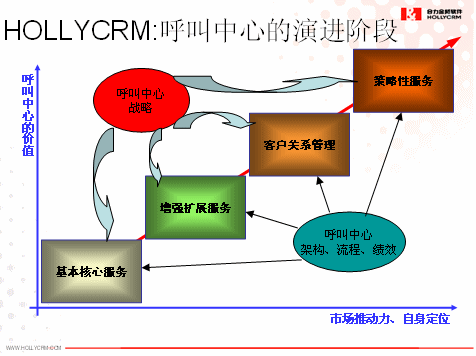 其次,我們認(rèn)為企業(yè)呼叫中心的建設(shè)不可能一次到位,而是一個持續(xù)改進(jìn)和不斷完善的過程。企業(yè)建設(shè)呼叫中心將是一個分階段分步驟的建設(shè)過程,將在其規(guī)劃的呼叫中心戰(zhàn)略的指引下和呼叫中心架構(gòu)、流程和績效的支撐上會經(jīng)歷基本核心服務(wù)、增強(qiáng)擴(kuò)展服務(wù)、客戶關(guān)系管理和策略性服務(wù)等幾個主要的階段,這就需要前期做好整體規(guī)劃,然后分階段實施,確保前期投資在后期依然可用就非常重要了,具體如下圖所示: