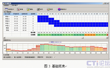 引入呼叫中心排班系統(tǒng)是提升坐席資源利用率的有效解決方案,排班系統(tǒng)可以對大量的歷史呼叫數據進行分析,并剔除特殊事件對呼叫量的影響,從而得出呼叫量變化的規(guī)律曲線,再輔助對特殊預期事件影響度的疊加,可以對未來一定時間的呼叫量變化做出比較客觀的預測(圖2)。在預測話務量變化曲線的同時,結合人員技能和班次設定,給出高擬合度的人工排班方案(圖3)。更為重要的是,成熟排班系統(tǒng)提供的話務預測模型多具備學習能力,能夠將預測的話務數據與實際話務數據進行對比,從而不斷提高話務預測模型的預測精度。成熟排班工具可以在保持呼叫中心同等服務水平的前提下,降低人工坐席代表的投入數量,進而釋放部分人工資源開展其它業(yè)務。