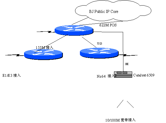 北京電信公眾IP網(wǎng)中,骨干網(wǎng)核心節(jié)點路由器為業(yè)界最 先進的新一代電信級高性能的路由交換機 Cisco GSR 12016太比特系統(tǒng); 邊緣節(jié)點路由器為GSR 12008,Cisco 7513;10/100M局域網(wǎng)接入設(shè)備為Catalyst 6509交換機。