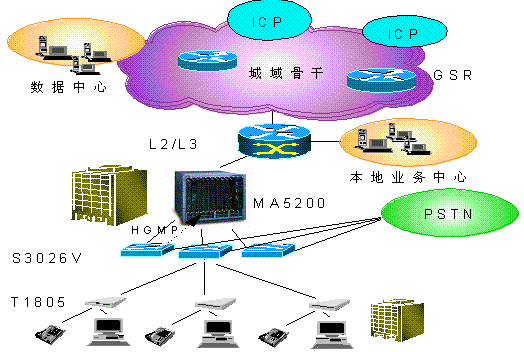 另外,Quidway S3026V可與華為公司MA5200等組網(wǎng),通過HGMP(Huawei Group Management Protocal)華為組管理協(xié)議,S3026V與華為MA5200、S3526等上行管理設(shè)備共同提供寬帶接入網(wǎng)的整網(wǎng)解決方案,實現(xiàn)對Quidway(R) S3026V的集中管理,為用戶提供更廣泛、更豐富的業(yè)務(wù)功能,充分體現(xiàn)華為公司在寬帶網(wǎng)絡(luò)上具有的“可運(yùn)營、可管理、可維護(hù)”優(yōu)勢。 如圖2所示: