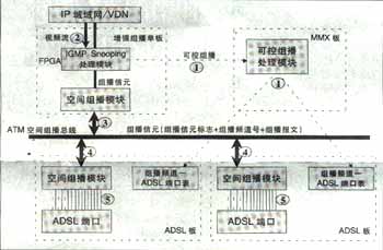 可實現(xiàn)高效的兩級組播;诳臻g總線上的組播信元技術(shù)實現(xiàn),與組播用戶數(shù)無關(guān),同一節(jié)目即使所有用戶加入該頻道,僅需復(fù)制一份,不用逐個用戶復(fù)制到每個用戶端口,極大節(jié)省了背板帶寬,減輕IP上行負擔(dān)。可實現(xiàn)高性能硬件組播轉(zhuǎn)發(fā)。IP上行板采用超大規(guī)模FPGA硬件邏輯處理組播報文,ADSL板采用空間組播處理硬件芯片自動完成向每個ADSL端口(用戶)的組播復(fù)制,每ADSL端口組播帶寬6M。