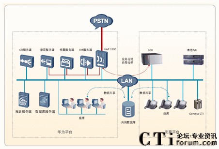 客戶電話通過(guò)PSTN統(tǒng)一由華為UAP3300排隊(duì)機(jī)接入,由華為平臺(tái)的IVR服務(wù)器進(jìn)行業(yè)務(wù)導(dǎo)航分流,根據(jù)用戶的選擇和IVR流程的配置進(jìn)行路由,可以選擇不同平臺(tái)來(lái)處理此業(yè)務(wù)。來(lái)話根據(jù)IVR流程路由后,兩個(gè)平臺(tái)采用負(fù)荷分擔(dān)方式進(jìn)行工作。在將來(lái)話導(dǎo)入兩個(gè)平臺(tái)后,采用不同設(shè)備的IVR進(jìn)行業(yè)務(wù)分配,不同平臺(tái)的座席處理不同的業(yè)務(wù)。在處理過(guò)程中,不同平臺(tái)的座席之間可以互轉(zhuǎn),達(dá)到全網(wǎng)資源共享的功能。