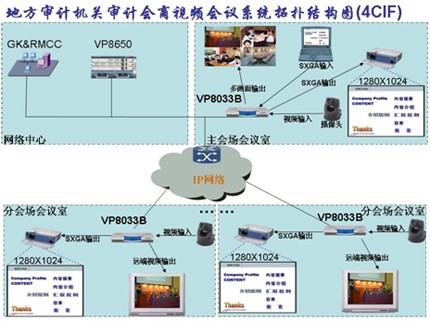 本系統(tǒng)在審計(jì)署機(jī)房配置網(wǎng)絡(luò)控制中心GK、多點(diǎn)資源管理系統(tǒng)和ViewPoint 8660 MCU設(shè)備。多點(diǎn)資源管理中心實(shí)現(xiàn)對(duì)MCU、電視會(huì)議和全網(wǎng)資源的統(tǒng)一調(diào)度,GK實(shí)現(xiàn)對(duì)IP終端入會(huì)時(shí)鑒權(quán)認(rèn)證,在主會(huì)場會(huì)議室架設(shè)一臺(tái)ViewPoint 8033B分體式視訊終端。在各分會(huì)場會(huì)議室架設(shè)一臺(tái)ViewPoint 8033B分體式視訊終端;在所有會(huì)場各架設(shè)一臺(tái)標(biāo)清攝像機(jī)、一個(gè)麥克風(fēng)、一臺(tái)高清電視或一臺(tái)高清投影機(jī)。