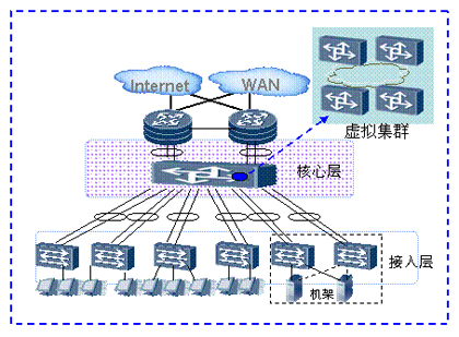 如上圖所示,整個數(shù)據(jù)中心網(wǎng)絡(luò)通過虛擬集群技術(shù),多個核心層設(shè)備虛擬為一臺設(shè)備。通過增加核心節(jié)點,提供無阻塞的網(wǎng)絡(luò)能力,接入更多服務(wù)器。服務(wù)器的規(guī)模可以從3000臺“無級擴展”到數(shù)萬臺。在滿足企業(yè)日益增長的業(yè)務(wù)需求的同時,并不增加網(wǎng)絡(luò)的復(fù)雜度,減少管理和維護的成本。