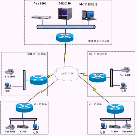 中心MCU采用美國(guó)POLYCOM公司 MGC-50多點(diǎn)控制單元,安裝在中儲(chǔ)糧北京總公司的中心機(jī)房。北京總公司主會(huì)場(chǎng)安放POLYCOM VSX