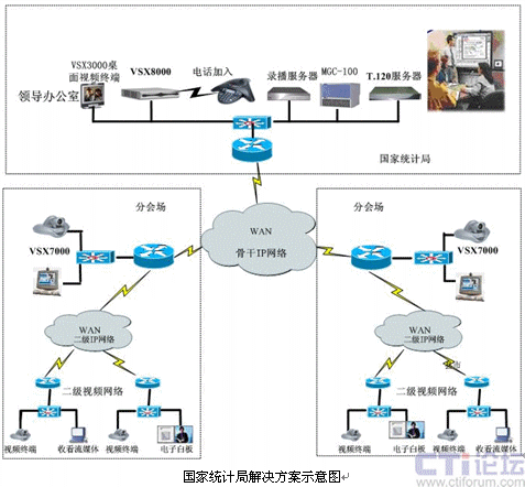 為確保如此巨大的視頻會議系統(tǒng)的應(yīng)用效果,視頻會議系統(tǒng)的各個設(shè)備全部采用POLYCOM公司的產(chǎn)品。寶利通(POLYCOM)公司依靠自身豐富的經(jīng)驗、領(lǐng)先的產(chǎn)品和技術(shù)以及豐富的項目部署經(jīng)驗,結(jié)合國家統(tǒng)計局的實際需求,提出了全套的視頻會議系統(tǒng)解決方案,并最終憑借產(chǎn)品出色的視音頻質(zhì)量、良好的穩(wěn)定性和先進的技術(shù)、以及出色的服務(wù)贏得了用戶的認可,成功中標國家統(tǒng)計局視頻會議系統(tǒng)項目.該系統(tǒng)可最大限度地發(fā)揮其現(xiàn)有IP寬帶網(wǎng)絡(luò)的優(yōu)勢,加快對具體事件的處理速度,節(jié)約辦事人員的路途時間,最大限度地提高政府的辦公效率,降低辦公費用。