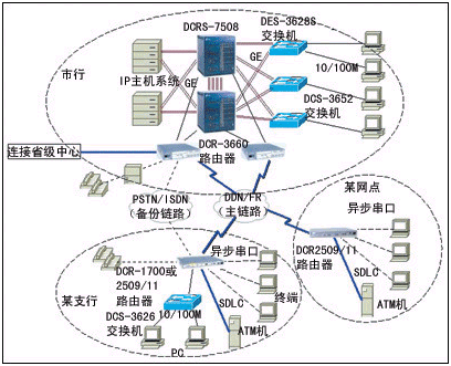 對于業(yè)務比較少的網點,使用DCR-2501或DCR-2509路由器;對于業(yè)務比較多的網點,使用DCR-2511或DCR-1720或DCR-1750路由器。營業(yè)網點使用DCR-2500或1700系列路由器,既實現(xiàn)柜員終端、IP業(yè)務等綜合業(yè)務接入,又能用以太口將辦公網絡連接起來,實現(xiàn)真正的綜合業(yè)務接入。原有遠程終端可以直接連在DCR-2500或1700系列路由器上,通過IP網絡訪問網絡內任意位置的業(yè)務前置機,無須改動原有業(yè)務軟件,輕松實現(xiàn)銀行綜合業(yè)務。終端通過上述路由器可訪問支行和分行不同局域網上的多臺前置機,訪問時,不需要調用前置機的TELNET服務,且終端號固定。