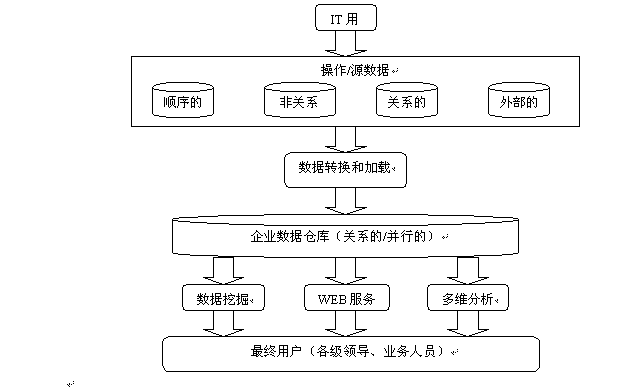 作為決策支持系統(tǒng)(DSS)的一種有效、可行的體系化解決方案,數(shù)據(jù)倉庫包括了三個方面的內(nèi)容: