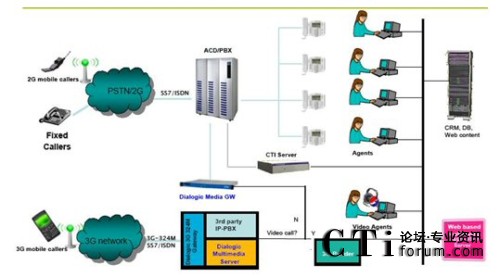 3G平臺(tái)既然可以起到這么關(guān)鍵的作用,那么如何實(shí)現(xiàn)這項(xiàng)服務(wù)呢?林克海德的產(chǎn)品可以幫助您完成平臺(tái)的搭建工作,基于背后Dialogic產(chǎn)品的全力支持,您可以實(shí)現(xiàn)web頁(yè)面到3G手機(jī)的視頻轉(zhuǎn)換,也可以與舊有的傳統(tǒng)呼叫中心(2G)互聯(lián)互通。您可以通過(guò)3G手機(jī)打到Dialogic視頻網(wǎng)關(guān),再通過(guò)3G
