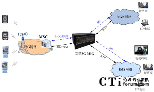 下圖所示為3G網(wǎng)絡(luò)視頻互聯(lián)的典型組網(wǎng)解決方案。3G側(cè)信令可以采用ISUP/TDM的方式連接到艾諾3G MIG,媒體采用 3G-324M/TDM的方式連接。3G側(cè)也可以信令采用BICC/IP,媒體采用3G-324M/NbUP的方式連接到3G MIG上。而NGN/IMS側(cè)信令采用SIP,媒體采用RTP 方式進(jìn)行連接。艾諾3G MIG支持BICC/ISUP混合接入,以及同時(shí)接入NGN和IMS網(wǎng)絡(luò)。