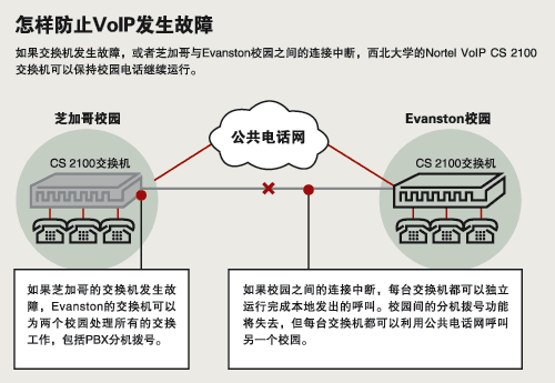 美國西北大學(xué)原來的兩臺運(yùn)營商級SL-100電話交換機(jī)(一臺安裝在芝加哥校園,一臺安裝在Evanston校園)已經(jīng)用了差不多20年。升級的目標(biāo)是將兩臺獨立的交換機(jī)合并為一臺邏輯交換機(jī)來減少管理復(fù)雜性。同時,不必更換全部數(shù)字電話。最終他們決定升級到同時支持VoIP和TDM的Nortel CS 2100 VoIP,這樣用戶不用被迫把他們的電話換為VoIP電話。Carr說:“不管是那些希望利用VoIP性能的用戶,還是想繼續(xù)使用當(dāng)前電話特性和服務(wù)的用戶,可以各取所需!