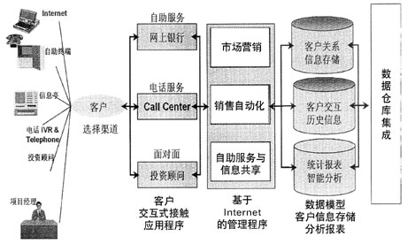 針對(duì)商業(yè)銀行面臨的挑戰(zhàn)和真實(shí)的需要,Oracle開發(fā)了面向銀行業(yè)的CRM解決方案。該解決方案提供全方位、統(tǒng)一的多渠道協(xié)同的客戶交互服務(wù)入口,包括網(wǎng)上自助服務(wù)、網(wǎng)上他助服務(wù)(通過Call Center在線指導(dǎo)客戶理財(cái)或提供投資建議)、電話自助服務(wù)、電話專家服務(wù)、電話智能市場(chǎng)推銷和銷售等。現(xiàn)場(chǎng)服務(wù)則提供客戶經(jīng)理與客戶面對(duì)面交流的能力,包括知識(shí)共享(金融市場(chǎng)信息、銀行產(chǎn)品信息和各業(yè)務(wù)部門發(fā)布的信息等)、銀行信息的及時(shí)獲取、產(chǎn)品和服務(wù)介紹、適時(shí)的投資建議、客戶交易行為追蹤、通過智能化工具提供專家服務(wù)、銷售機(jī)會(huì)管理等,允許重點(diǎn)客戶通過Web、電話或與客戶經(jīng)理/投資顧問面談等方式,提供更靈活的服務(wù)選擇和更及時(shí)的服務(wù),以保留大客戶群,增長(zhǎng)股東利益。