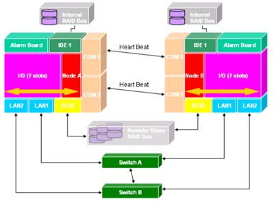 在網絡方面,上圖的兩臺CompactPCI系統(tǒng)各有兩個LAN,分別可透過Switch經由防火墻連接到外部網絡。兩個Switch之間有網絡連通,且每個系統(tǒng)至少有兩個LAN可維持系統(tǒng)的網絡通暢。