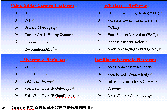標(biāo)準(zhǔn)之眾多解決方案,使設(shè)備供貨商與服務(wù)供貨商能根據(jù)自己需要,結(jié)合IP、ATM、IN、TDM眾家之長(zhǎng),建設(shè)開放式電信等級(jí)的寬頻網(wǎng)絡(luò)架構(gòu),不但降低網(wǎng)絡(luò)建設(shè)及運(yùn)行維護(hù)成本,更能快速提供新加值服務(wù)、搶占新市場(chǎng)、滿足用戶不斷變化的需求。CompactPCI寬頻通訊平臺(tái)除了加快網(wǎng)絡(luò)基礎(chǔ)建設(shè)的建置速度,更提供具彈性、可靠性及擴(kuò)充性的網(wǎng)絡(luò)運(yùn)算解決方案,發(fā)展出各種為電信服務(wù)業(yè)者所量身訂作的高密度IP運(yùn)算關(guān)鍵核心。