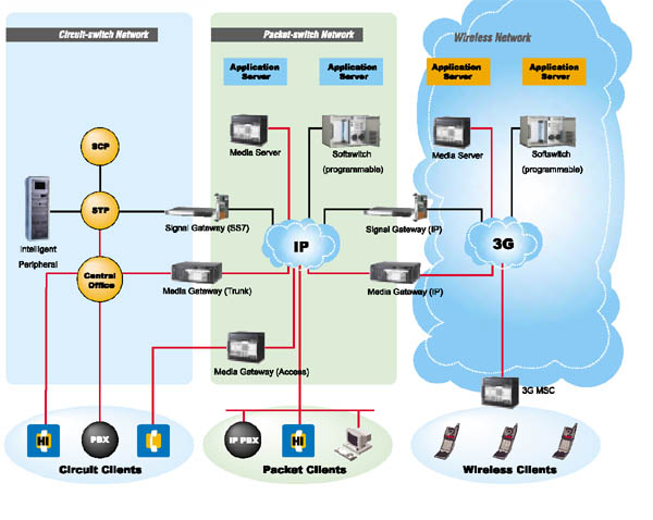 在下一帶網(wǎng)絡(luò)(NGN)中媒體網(wǎng)關(guān)在軟交換(softswitch)的控制下,將一種網(wǎng)絡(luò)中的媒體轉(zhuǎn)換成另一種網(wǎng)絡(luò)所要求的媒體格式。如媒體網(wǎng)關(guān)能夠在電路交換網(wǎng)的承載通道和分組網(wǎng)的媒體流之間進(jìn)行轉(zhuǎn)換,可以處理音頻、視頻或T.120,也具備處理這三者任意組合的能力,并且能夠進(jìn)行全雙工的媒體翻譯,可以演示視頻/音頻消息,實(shí)現(xiàn)其他IVR功能,同時(shí)還可以進(jìn)行媒體會(huì)議等。