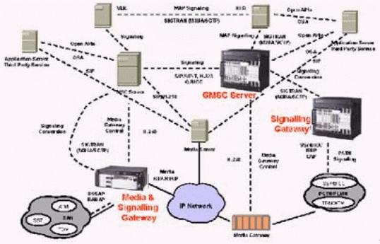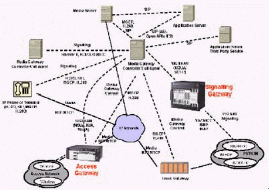 本例中的媒體網(wǎng)關(guān)控制器(MGC)終結(jié)所有的信令,包括直接傳輸?shù)暮屯ㄟ^(guò)IP的信令,完成如一個(gè)SIP電話向PSTN網(wǎng)絡(luò)發(fā)送信號(hào)之類(lèi)的信令互通,還對(duì)打到VoIP網(wǎng)絡(luò)的呼叫進(jìn)行鑒權(quán)和選擇路由,并提供計(jì)費(fèi)信息。這個(gè)MGC還通過(guò)SIP/SIP-T,H.323或Q.BICC與其他的MGC通信。