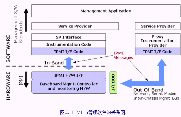 由圖二我們可以看出,IPMI的界面以及上層的管理都需求一些軟件來支持,以下將簡略的描述IPMI所涉及到的軟硬件種類: