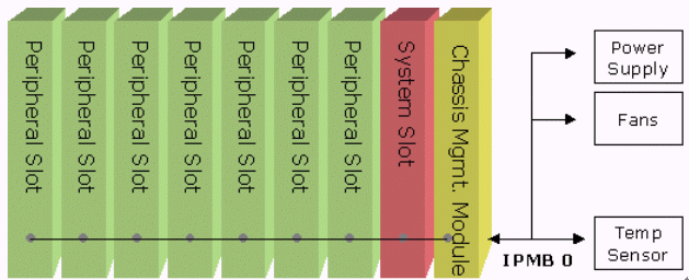 - 標準型IPMI系統(tǒng):利用背板上的IPMB總線,在系統(tǒng)槽上的CompactPCI單板上設(shè)計一顆BMC的控制器,其余在PCI插槽上的外圍片只要存在簡單的IPMI命令兼容的控制器,系統(tǒng)槽的單板即可透過IPMB讀取所有外圍片的狀態(tài),然后再經(jīng)由序列或是網(wǎng)絡(luò)的形式通知系統(tǒng)管理者。