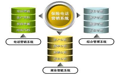 保險電話營銷系統(tǒng)從功能上分為電話營銷、綜合管理以及商業(yè)智能三大子系統(tǒng)。其功能結(jié)構(gòu)圖如下: