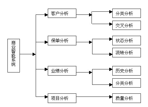 通過商業(yè)智能可以實現(xiàn)對客戶分析、保單分析、業(yè)績分析和項目分析等各項內(nèi)容進行管理分析。它包含5個決策分析模型以及超過60種的商業(yè)智能分析報表,內(nèi)嵌式數(shù)據(jù)挖掘模型與決策分析報表為電話營銷管理人員提供了有力的分析工具,對于銷售管理起到了定量分析、定性決策的重要支撐作用,支持不同層次的管理者進行不同范圍的決策。其系統(tǒng)架構(gòu)圖如下:
