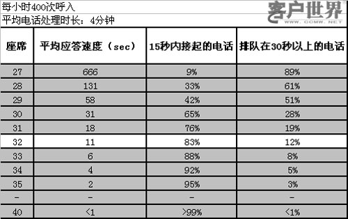 然而,圖3從客戶感受的角度來分析問題。從客戶的角度來看,客戶聯(lián)絡(luò)中心提供的服務(wù)并沒有達(dá)到他們期望。對于每個來電者最首要的問題是要求在幾秒鐘內(nèi)接通電話。如果所有的座席都忙碌,這種可能性就會大大降低了。如果在線座席代表數(shù)量不足,則平均排隊(duì)時間就會增加,這將導(dǎo)致客戶的不滿,進(jìn)而將他們的業(yè)務(wù)轉(zhuǎn)向別處。