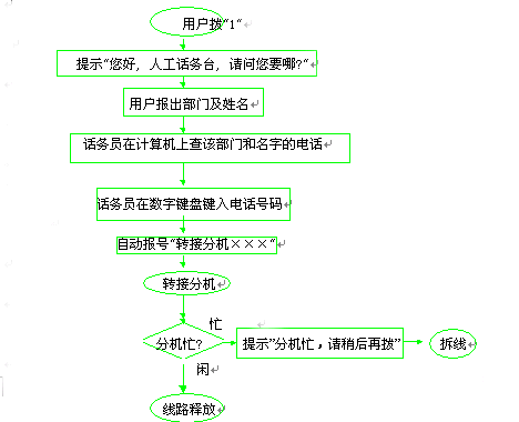 話務(wù)員不需要說(shuō)話, 系統(tǒng)在所有必要之處都有提示音, 話務(wù)員只要在數(shù)字鍵盤上鍵入部門號(hào)"0××"和電話號(hào)碼"2××"。
