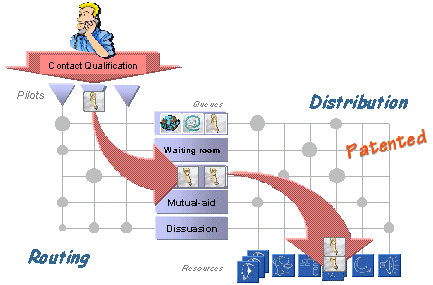 CCD智能呼叫分配器對經(jīng)過呼叫特性鑒別并進(jìn)入引導(dǎo)系統(tǒng)的呼叫,通過路由選擇矩陣進(jìn)入不同的等待隊列,并由第二個雙向分配矩陣進(jìn)行資源選擇或呼叫選擇。CCD先進(jìn)的雙矩陣分配方式,通過其獨特的技巧和費用最低的路由算法來管理呼叫業(yè)務(wù)和資源,其性能超過當(dāng)前工業(yè)標(biāo)準(zhǔn)。這種呼叫分配算法的顯著特點之一是恰到好處地分離路由選擇、資源分配以及選擇呼叫三個過程,使其既相對獨立,又靈活選擇。而傳統(tǒng)的“矢量分配”法的主要缺點是僅從呼叫的觀點描述處理,缺乏對正空閑的資源該做些什么加以控制。
