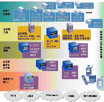 阿爾卡特朗訊會話管理實現(xiàn)IMS的P-CSCF、I/S-CSCF和BGCF的功能,網(wǎng)關(guān)控制包括MGCF和IBCF。會話管理支持2G/3G的GGSN、CAMD的PDSN、WLAN的PDG、固定有/無線的ABG的接入和會話處理。網(wǎng)關(guān)控制MGCF負責(zé)與傳統(tǒng)交換網(wǎng)絡(luò)PSTN和PLMN的互通,IBCF負責(zé)與VoIP網(wǎng)絡(luò)、IMS網(wǎng)絡(luò)和其他基于IP的多媒體網(wǎng)絡(luò)互通。接入網(wǎng)關(guān)控制實現(xiàn)電話仿真系統(tǒng)的功能。它控制A-MGW接入傳統(tǒng)固定終端,通過IMS的電話業(yè)務(wù)服務(wù)器提供各類電話基本業(yè)務(wù)和補充業(yè)務(wù)。