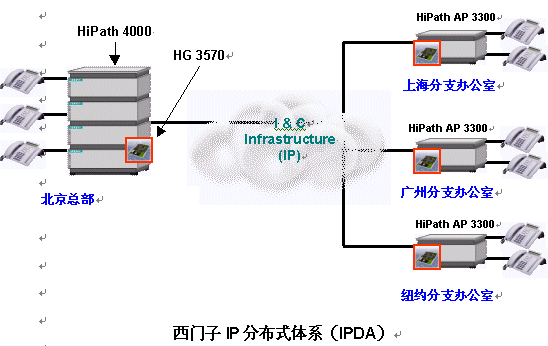 IP分布式體系(IPDA)建于西門子HiPath通信平臺之上,它能解決您的上述煩惱。在各分支辦公室部署HiPath接入點(diǎn)(Access Point)后,同時(shí)在集成IP網(wǎng)關(guān)HiPath HG 3500家族的幫助下,HiPath能夠建立起一個(gè)將所有分支辦公室包括在內(nèi)的IP通信網(wǎng)絡(luò)。