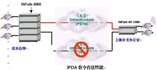 人們也許會(huì)問,IP語音(VoIP)是否足夠可靠?如果IP網(wǎng)絡(luò)上的信令通道出現(xiàn)故障,HiPath平臺仍將保證對各接入點(diǎn)的控制,從而提供了可靠的信令存活性能(Signaling Survivability)。在下面的圖例中,當(dāng)企業(yè)IP網(wǎng)絡(luò)出現(xiàn)某些問題后,信令通道轉(zhuǎn)移到了公共交換電話網(wǎng)絡(luò)(PSTN)之上。