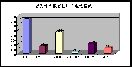 尚有相當多地區(qū)沒有開通此類服務,用戶感到遺憾。在“您為什么沒有使用‘電話精靈’?”的統(tǒng)計結果中“當?shù)貨]有開通”是一項主要原因,有不少用戶都留言希望能將電話精靈業(yè)務在更廣泛地區(qū)應用。曾經使用過“電話精靈”,但后期由于運營商停止了此項業(yè)務而不再使用的用戶也深感遺憾。