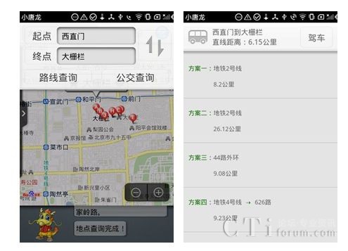 打開自駕車查詢,小唐龍做了詳細(xì)的路線引導(dǎo),同樣貼心的是公交查詢它也很快給你列出最佳的行車路線方案。另外還可將駕車路線收藏,以備日后需要時方便查詢。