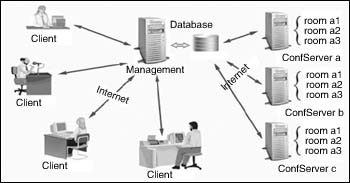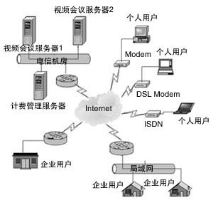用戶可通過從56K撥號(hào)上網(wǎng)直至寬帶等各種方式接入該視頻會(huì)議系統(tǒng),包括PSTN撥號(hào)、ISDN撥號(hào)、ADSL撥號(hào)、LAN、PLC(低壓電力載波)等各種形式,在這個(gè)統(tǒng)一的視頻會(huì)議平臺(tái)上,實(shí)現(xiàn)多路音頻、多路視頻、文檔共享、電子白板、協(xié)同瀏覽、文件傳輸、文字交流等功能。系統(tǒng)的拓?fù)浣Y(jié)構(gòu)圖如左所示。